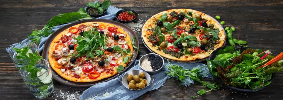 (ohne Tomatensoße) mit Mozzarella, Mortadella, Tris-Olivenvariation (leicht scharf), getrocknete Tomaten, Pistaziencreme